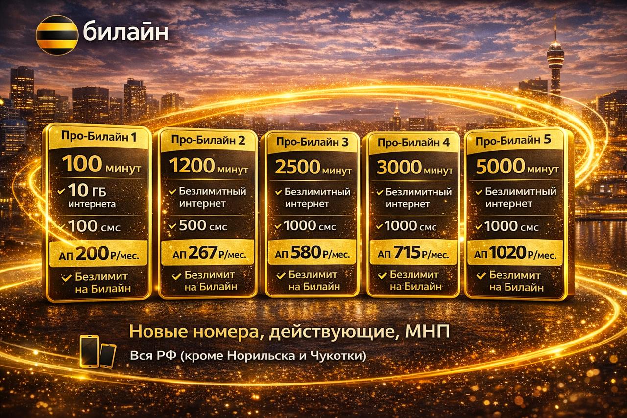 * Про-Билайн 5: 5000 мин / Безлимит интернет — 1020 ₽/мес. (Для бизнеса и активных звонков).